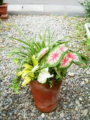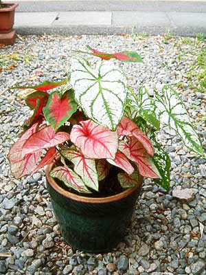 一般に流通している物は、プラスチックの鉢植えが殆どですが、陶器鉢にするだけでカラジュームのイメージが変わります。単品での存在感があります。
