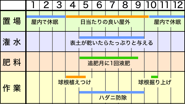 秋に入り気温が下がってくると、次第に葉が枯れてきます。葉が2〜3枚になったら水やりをやめ、土を乾かします。球根を堀上げまわりについている土を落としてから、バーミキュライトや乾いたオガクズなどに埋めて箱に入れて貯蔵します。