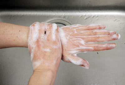 両手首を丁寧に揉みながら洗います。