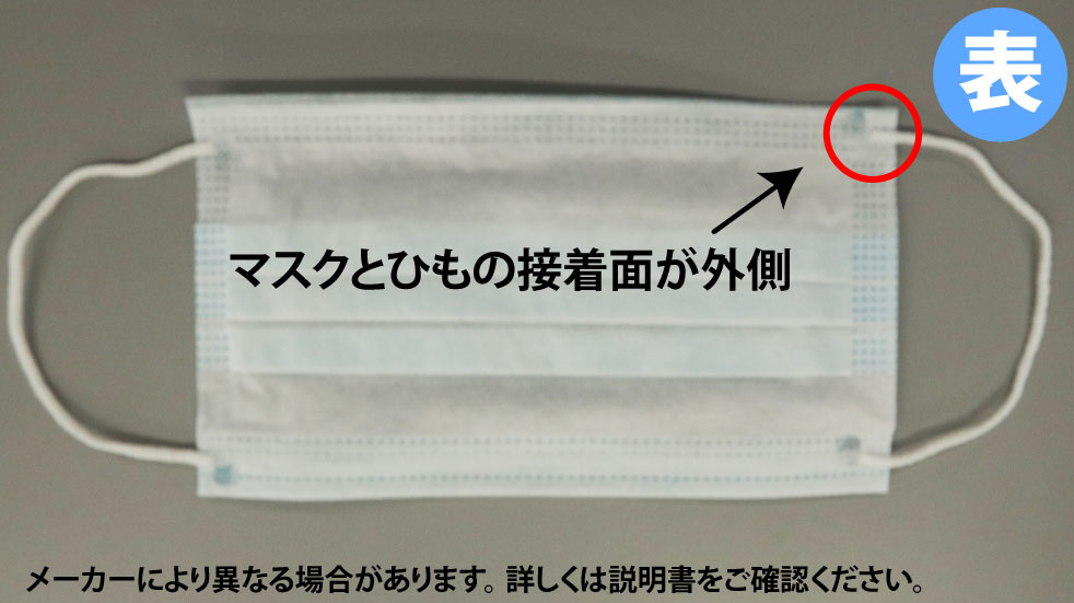 マスクの上下と表裏の確認をします。ワイヤーがある場所が上で、ひだが下向きの方向が下になります。