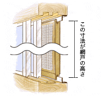 木製窓の場合は、網戸用レールが木の鴨居に取り付けられている上面から下面までの高さを測ります。