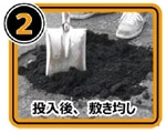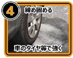 | 自然転圧 | 車を通行させて締固めます。施工面の全体を通行させてください。車の通行が難しい場合は根気よく押し潰すよう転圧していきます。 |