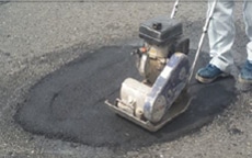 | 機械的に転圧 | 補修した箇所の周囲から締固めを行います。周囲の締固めが十分にできたら中央部分を転圧し、締固めていきます。 |