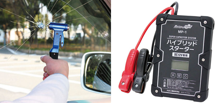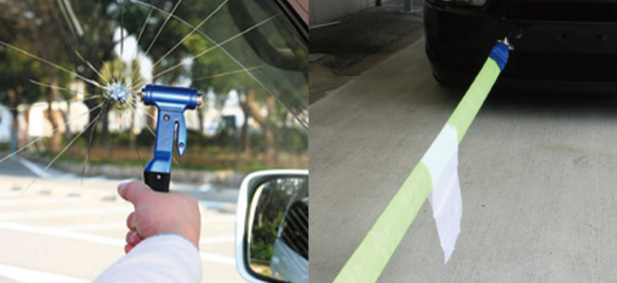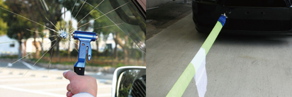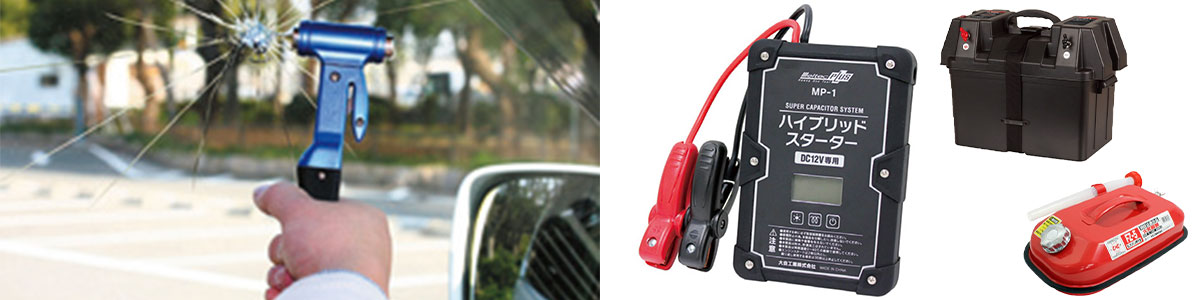 また車が水没した際に役立つ脱出ハンマーや緊急停車時の事故防止に役立つ三角停止板も取り扱っております。