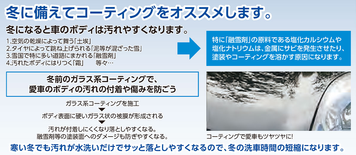 雪が降った際、道路にまかれる融雪剤は塗装やコーティングを溶かす塩化ナトリウム・塩化カルシウムが含まれておりますため、冬前に洗車やコーティングを実施するのがおすすめです。