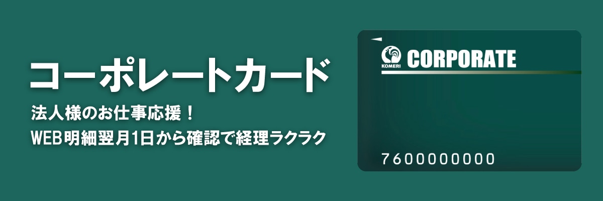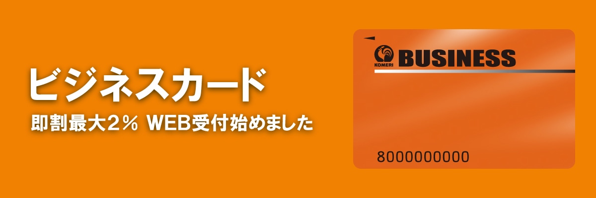 コメリの法人様向けビジネスカード。最大9枚まで発行可能。カードごとの購入商品明細で管理も簡単。即割サービスでその場で割引とお得なカード。