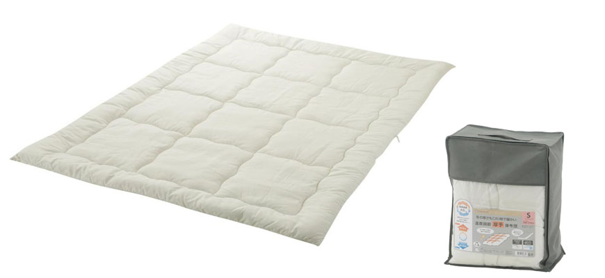中わたが温度を自動調節(寒い時は放出、暑い時は吸収)し、これ一枚で長く快適です。お手持ちの布団とフックで簡単に連結可能。側生地(片面)はすべり止め付きでカバー交換が楽々。抗菌防臭・防ダニ加工でいつでも清潔にお使いいただけます。