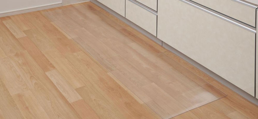 わずか1mmの薄さでつまずきにくい設計。表面はエンボス加工で滑りにくく、裏面にはズレ防止のすべり止めシートが4枚付属します。