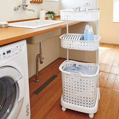 毎日使う浴室や洗面所はついつい乱雑になってしまいがちです。浴室整理用品で増えてしまったシャンプーや洗剤などもすっきりキレイに。洗濯に必要なものは洗濯機ラックでまとめておくことで使いやすく便利になります。あわせて、収納ケースなどで散らかりがちな小物類は種類で整理整頓。ランドリーバスケットを複数用意することで、洗濯物も種類ごとにまとめられるので、分別もらくちん。