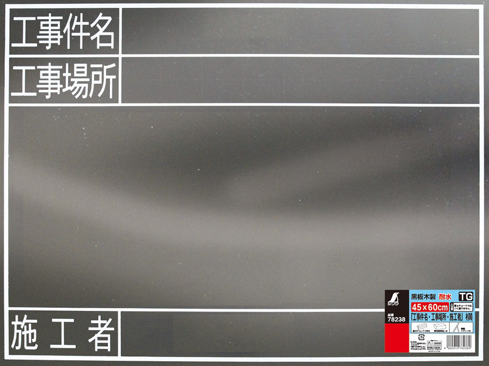雨の日でも使えます。 裏面スタンド付です。 ■仕様 ●印刷:工事件名・工事場所・施工者 ●横型 ■サイズ:450mm×600mm ■付属品:専用黒板消し・耐水チョーク3本 ■本体:木