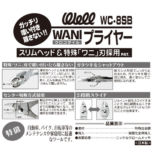 (1)薄型ヘッドと左右非対称の特殊「ワニ」刃により、狭い場所でも使いやすく、どんな部品でもガッチリ挟んで離しません。
