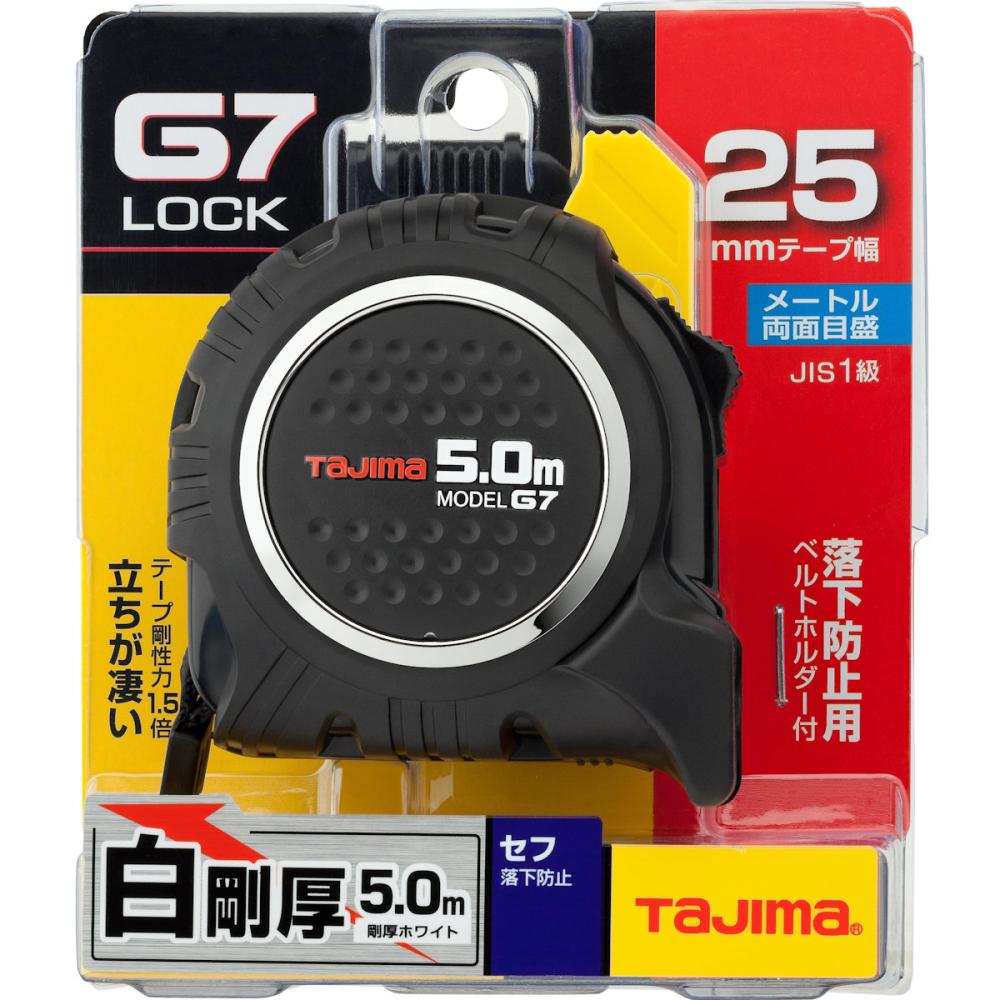 ●目盛仕様:メートル目盛、JIS1級、両面目盛。●テープ幅:25mm。●テープ長さ:5m。●剛厚ホワイトテープ。●ヨンゴーゴーピッチ表示付。●ストラップ付。●落下防止ベルトホルダー付、取り付け可能ベルトサイズ幅60mm以内・厚み5.5mm以内。●爪飛び防止用プロテクター付。●テープ:SK85(旧SK5)。●バネ:SK85(旧SK5)。●ケース:ABS樹脂。