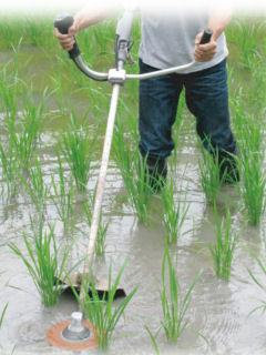 刈払機に簡単取付可能。稲株を傷つけない、水跳ねしにくい。軽量で前後左右細かく除草。