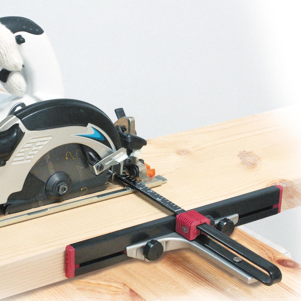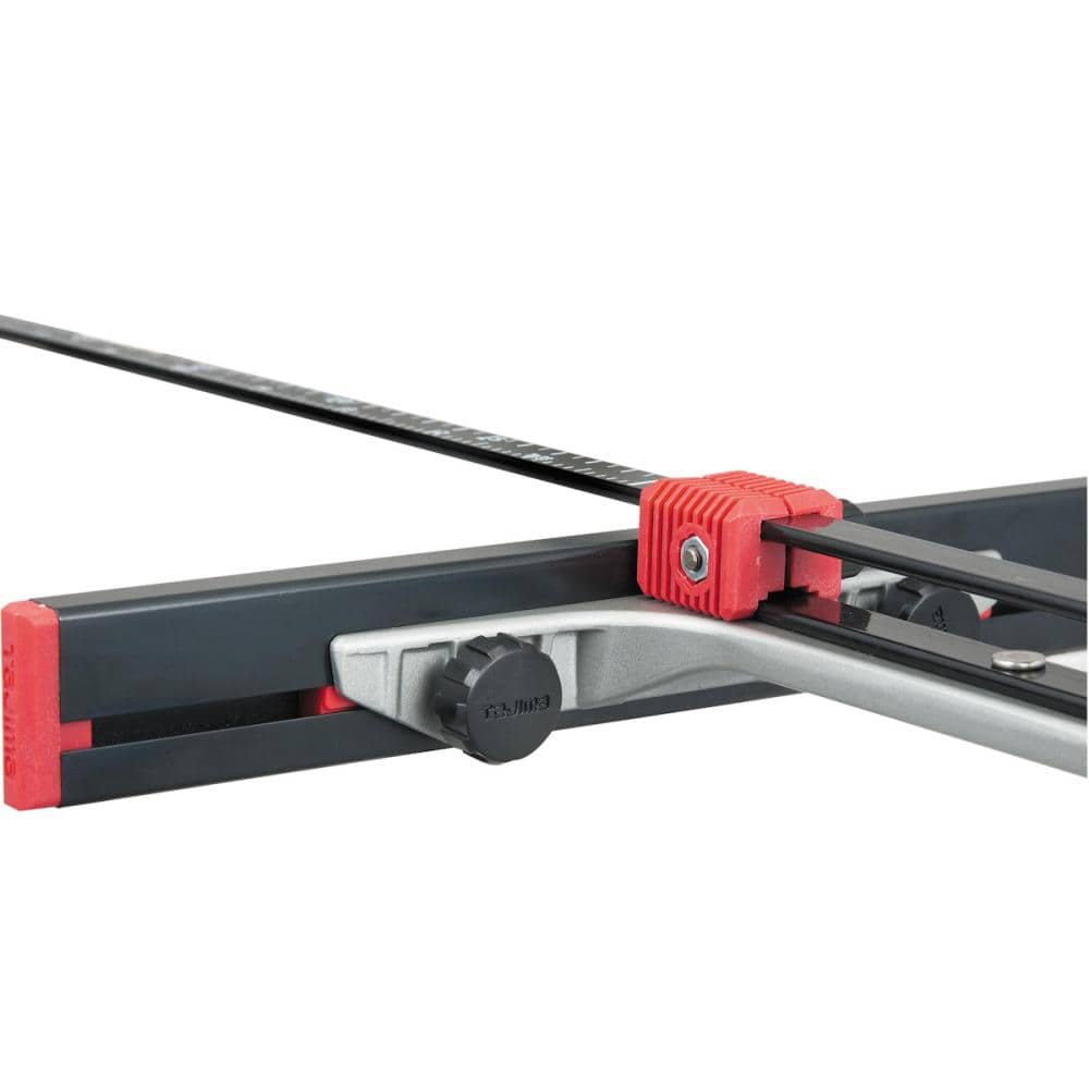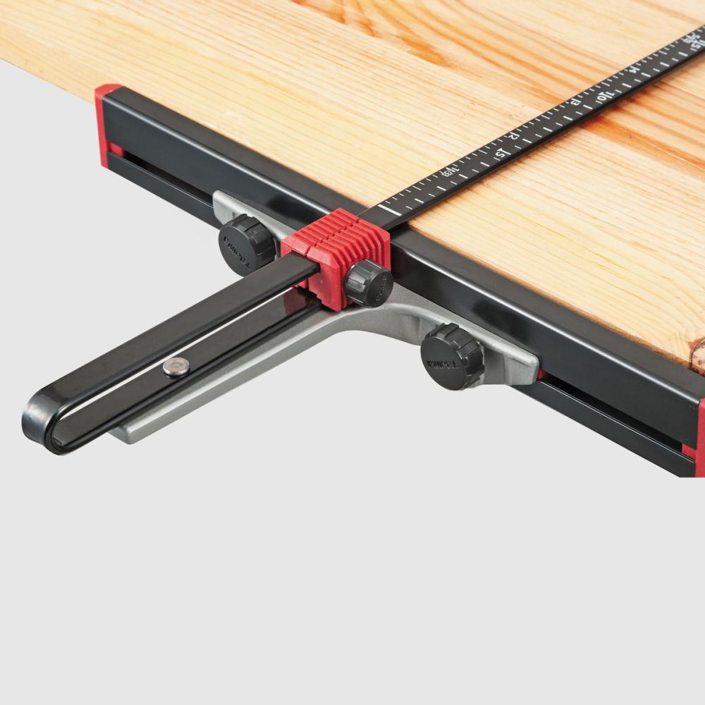 竿は曲がりに強く頑丈な焼入れ加工を採用しています。切断ピッチに合った竿長さ設定です。T定規の突き当てに滑りのよいフッ素樹脂塗装を採用しています。竿と突き当ての矩を安定させるブレ止め機構を搭載しました。竿と突き当てを支える本体は、軽量高強度のマグネシウムダイカストを採用しています。