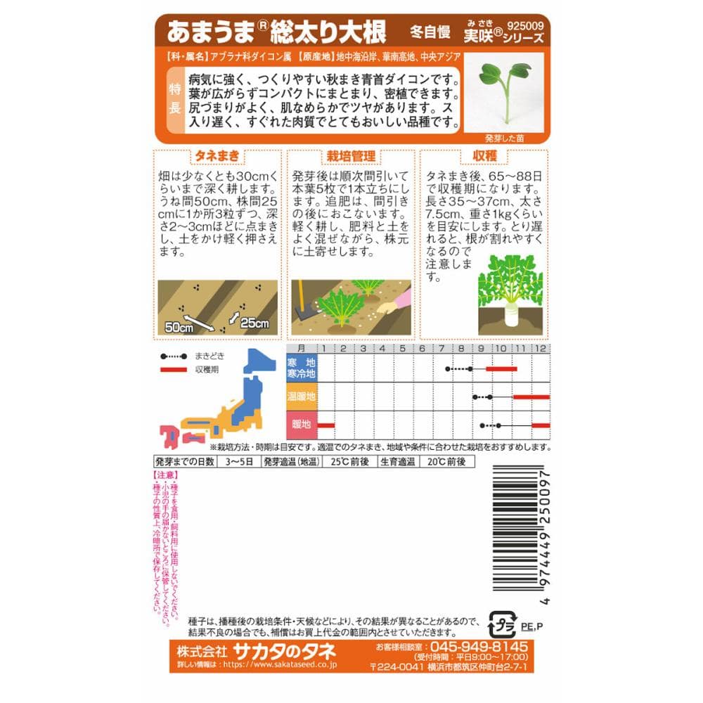 病気に強く、つくりやすい秋まき青首ダイコンです。葉が広がらずコンパクトにまとまり、密植できます。尻づまりがよく、肌なめらかでツヤがあります。ス入り遅く、すぐれた肉質でとてもおいしい品種です。