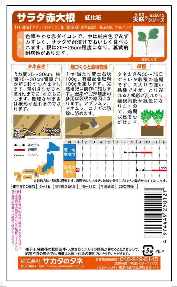 色鮮やかな赤ダイコンで、中は純白色でみずみずしく、サラダや酢漬けでおいしく食べられます。根は20~25cm程度になり、萎黄病耐病性があります。