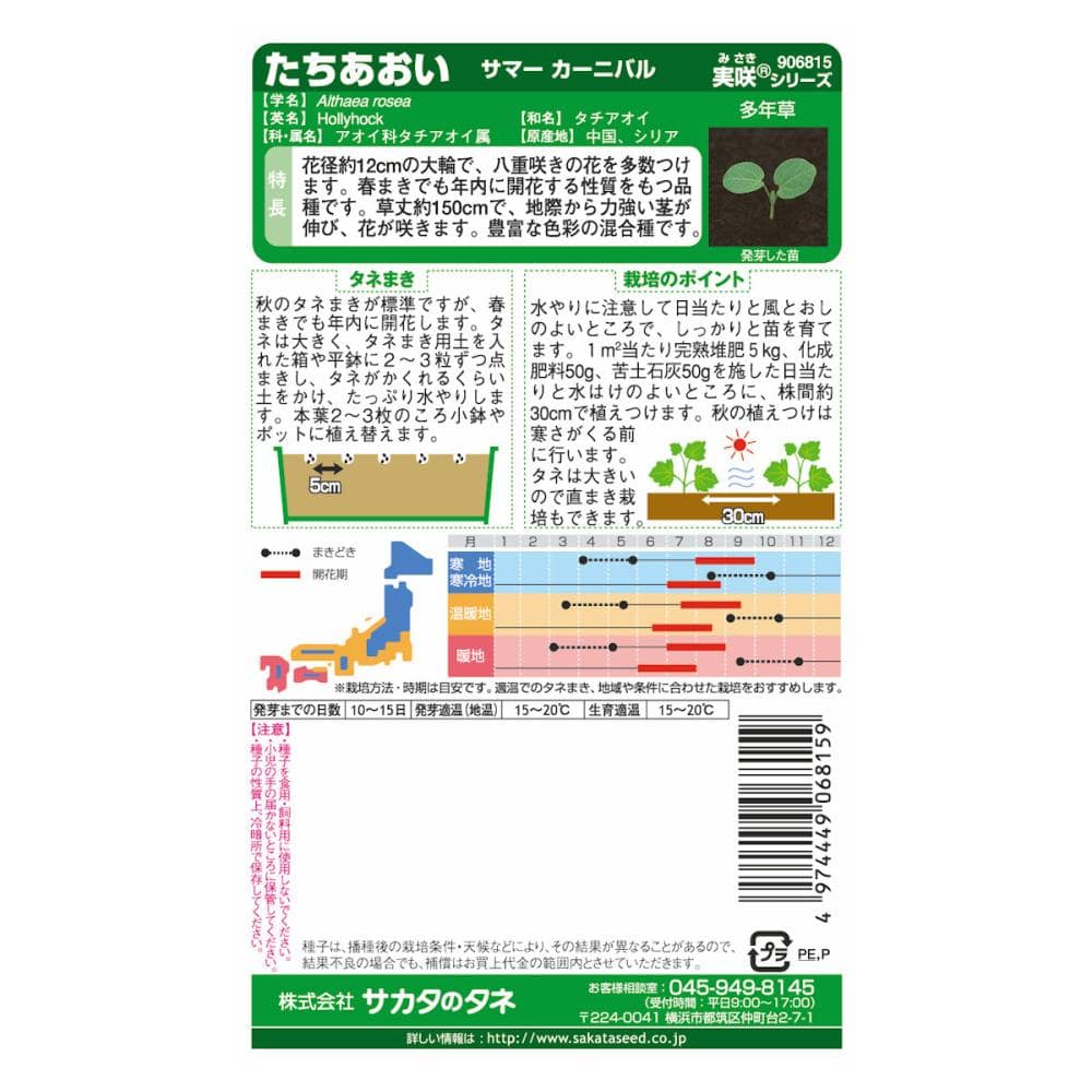 花径約12cmの大輪で、八重咲きの花を多数つけます。春まきでも年内に開花する性質をもつ品種です。草丈約150cmで、地際から力強い茎が伸び、花が咲きます。豊富な色彩の混合種です。