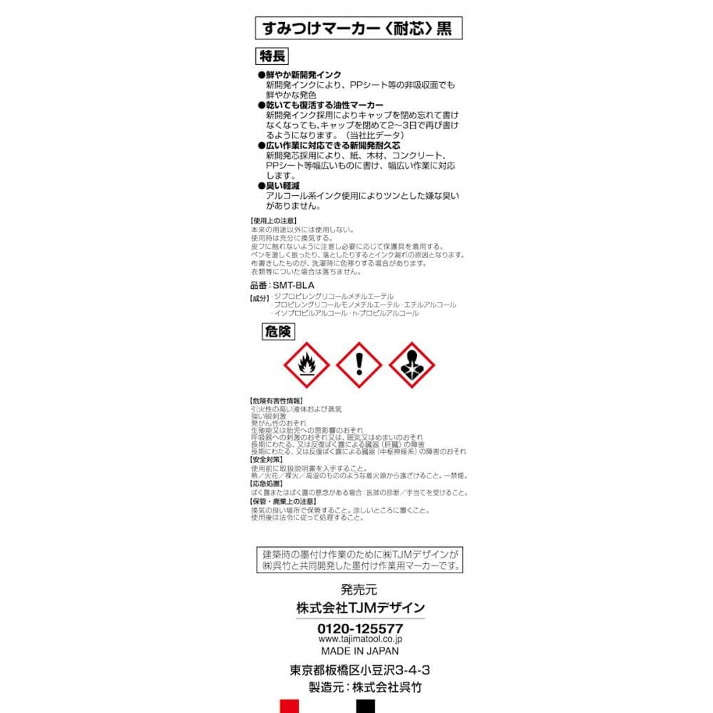 コンクリートのザラザラ面でも減りが少ない耐久芯を採用しています。絶妙なカットで細線・太線・文字も書きやすく、筆記線が確かな平芯です。プラスチックやガラス面で色が鮮明な油性ペンです。キャップを外して芯が乾いて書けなくなっても、キャップをすれば2~3日間で復活します(当社テストデータに基づく)。建築用すみつけマーカー。