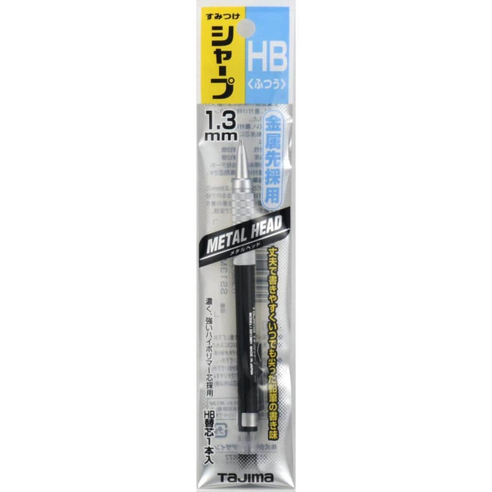 削る必要のない1.3mm芯でけがき、指示がはっきり読める濃さです。芯は文具事務用で定評ある、「ハイポリマー」芯を採用し、濃く書けて強度は従来粘土芯の約2倍です。驚異の筆記距離は約3倍です(市販品通常シャープ芯、鉛筆比)。ペン先がへたらないメタルヘッド仕様です。建築用すみつけシャープペン。