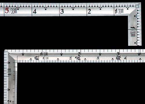 シルバー加工で表面の反射を抑え目盛が読み取りやすくなっています。 精度 直角度100mmにつき0.06mm以下 長さの許容差0.2mm以下 表目盛 長枝外目盛尺6 短枝外目盛8寸 裏目盛 長枝外目盛角目 内目盛吉凶、ホゾ 短枝:外目盛8寸 内目盛丸目 表示 赤数字入 十二支付 形状高級角厚 本体:ステンレス