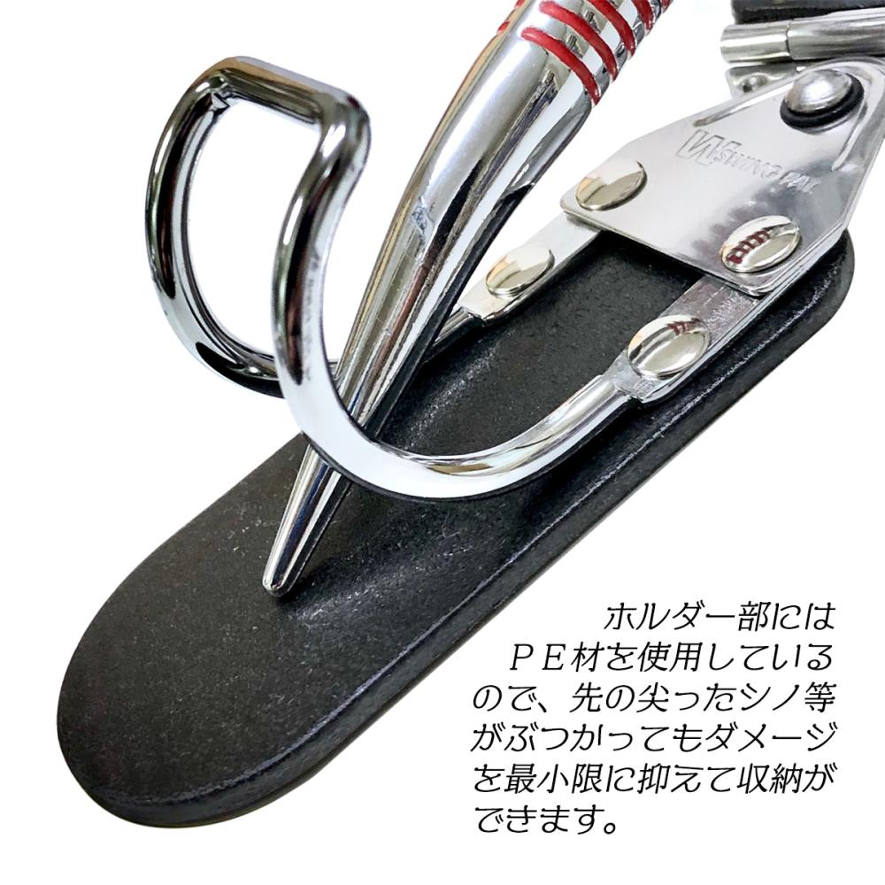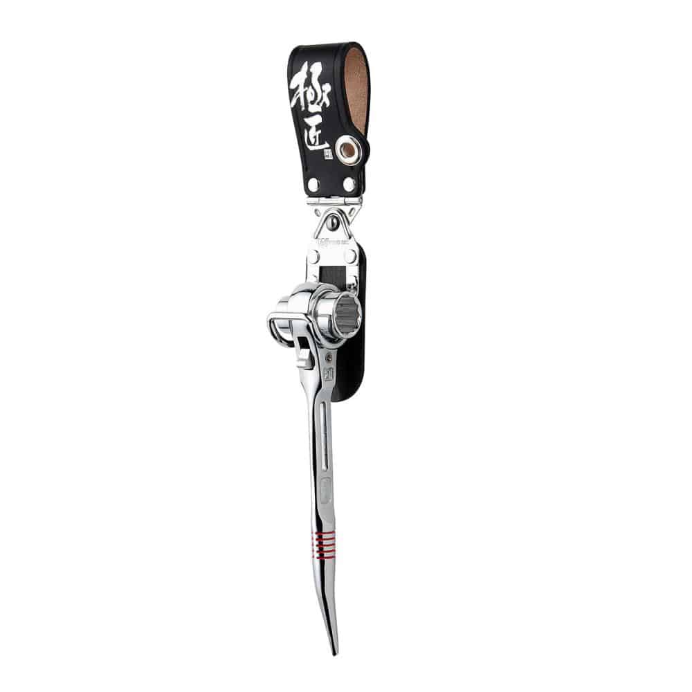 ラチェットレンチのほかに、電工用ドライバー等の収納に最適なダブルスイング式コンパクト黒革工具差しです。