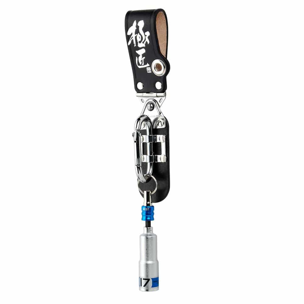 モンキーレンチ、ギヤラチェットレンチ等の収納に最適な小サイズ万能カラビナタイプを搭載。ダブルスイング式コンパクト黒革工具差しです。