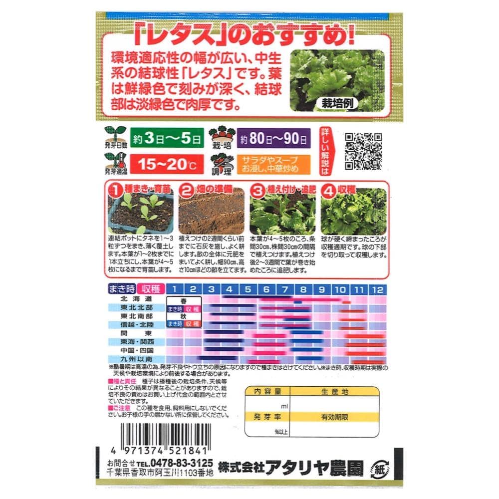 環境適応性の幅が広い、中生系の結球性レタスです。葉は鮮緑色で刻みが深く、結球部は淡緑色で肉厚です