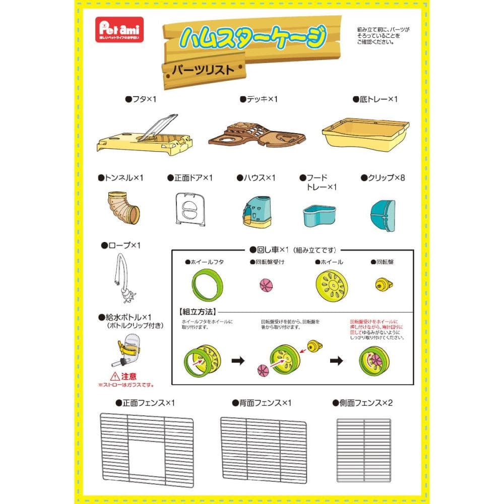 ・内部トンネルサイズ:約直径5.3cm(内径) ■パーツリスト ・フタ×1 ・デッキ×1 ・底トレー×1 ・トンネル×1 ・正面ドア×1 ・ハウス×1 ・フードトレー×1 ・クリップ×8 ・ロープ×1 ・給水ボトル(ボトルクリップ付き)×1 ・回し車×1(組立てです) ・正面フェンス×1 ・背面フェンス×1 ・側面フェンス×2