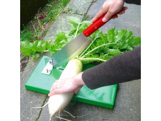 収穫物の根切りや葉落とし用。 持ち運びに便利で、使わないときの安全設計を重視しています。 切台は使用後に本体ごと洗えるスチール製です。 未使用時の収納に便利なコンパクト設計です。
