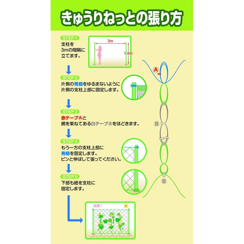 ●上部の青いロープをひっぱるだけでかんたん展張!●キュウリネットを初めて張る方にも使いやすい!