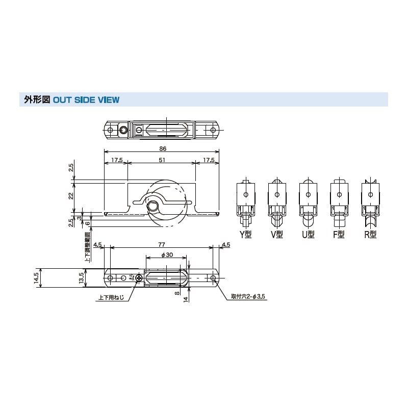 ●本体材質:スチール ●コマ径:Φ30mm ●コマ材質:POM ●軸受:DBブッシュ ●耐荷重 (2個使用時):20kg