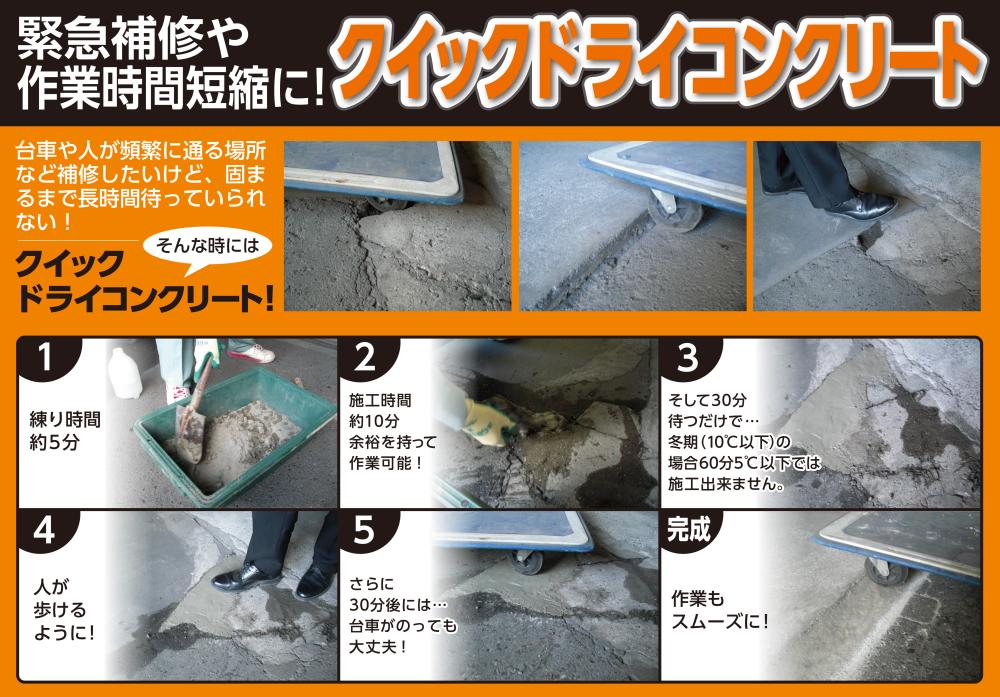 水を加えて練るだけの速乾コンクリートです。作業開始から約45分で歩行可能な強度が得られます。厚さ5cmで約0.2㎡使用できます。