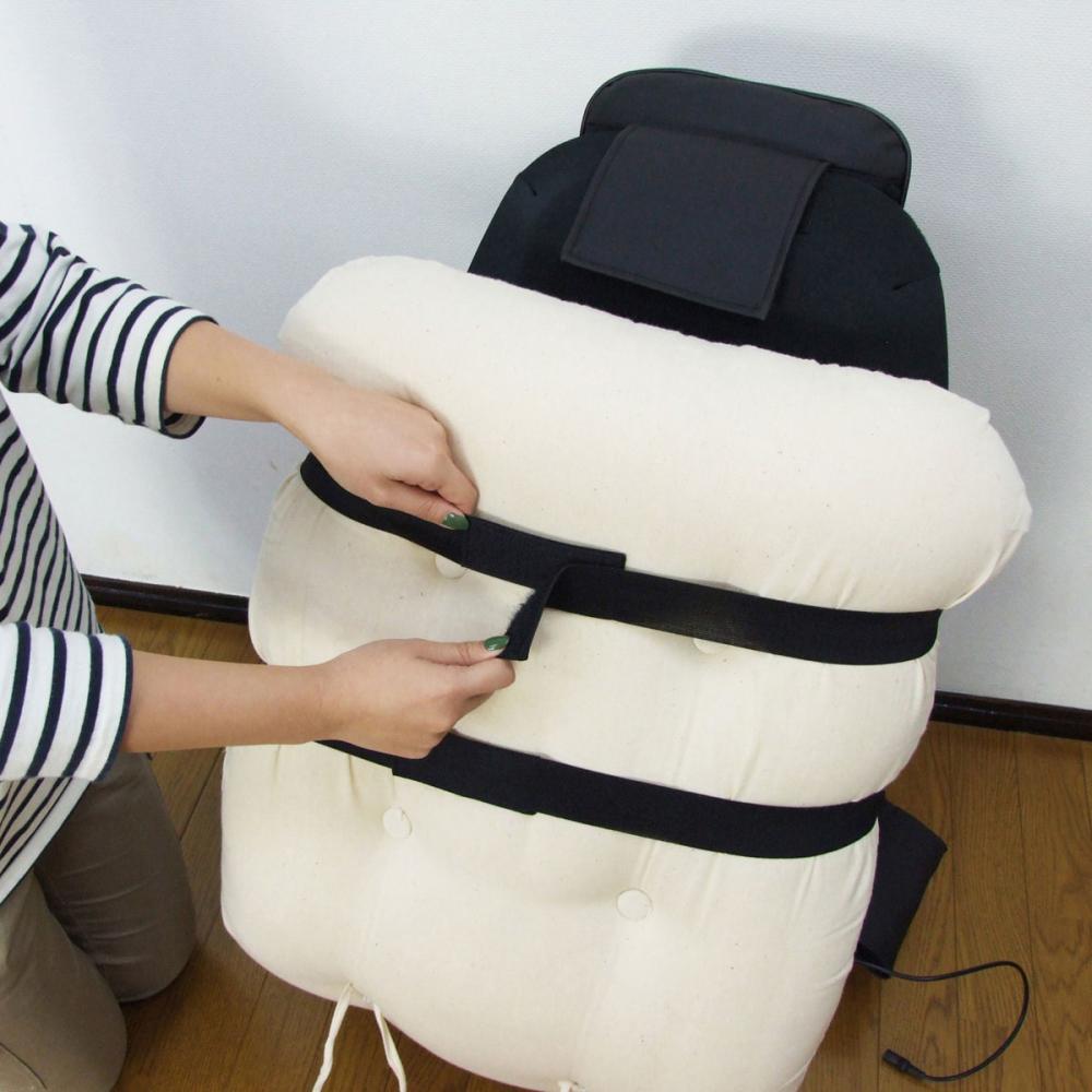3段階のバイブレーター機能付き(弱・中・強) もみ玉ライト点灯機能(ON/OFF) オートオフタイマー機能付き(15分自動停止) 軽量約3.3kgで持ち運びラクラク 背面にゴムバンドがあり、椅子に固定可能 折りたたみ可能でコンパクト収納 医療機器製造販売認証番号:229AGBZX00002000