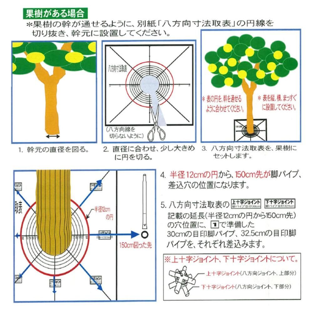年々増加の一途を辿る、鳥類による果樹の食害を防ぎます。果樹ドームは、8本の脚で果樹を囲い込み、専用の防鳥網で全体をドーム状に包んだものです。●ネットが直接触れないので、果実だけではなく樹木・葉・新芽・つぼみ等も外敵から守ります。果樹に優しい環境づくりで、健やかに栽培できます。●ネットを取り外すことなく、収穫や剪定作業を行なえます。果樹と人とストレスなくつきあえる資材です。