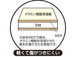 桐の芯材をMDFで挟み、メラミン樹脂を含浸させた紙を圧着させた化粧板です。