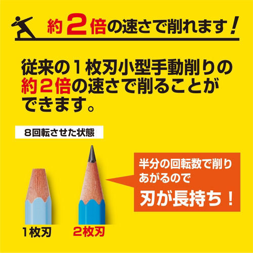 ・従来の1枚刃手動鉛筆削りの約2倍の速さで削ることができます。
