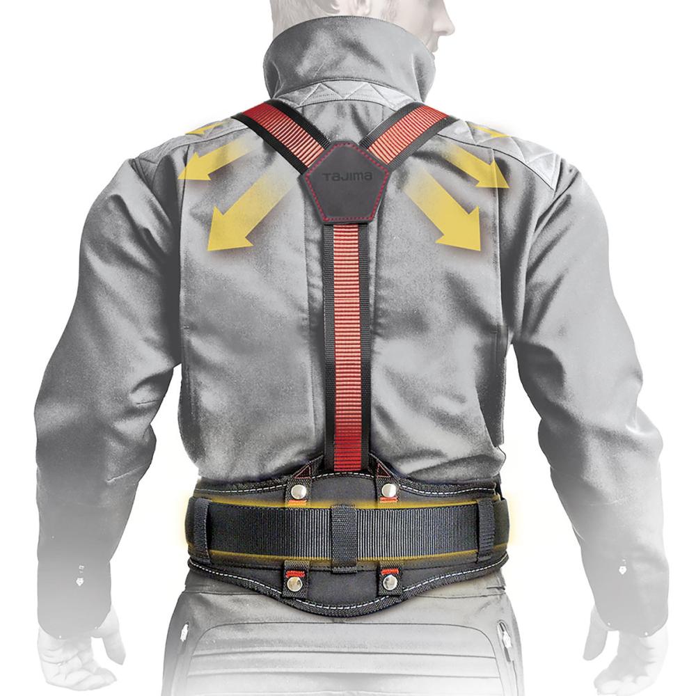 建築・工事用サスペンダー。体の動きになじむアクティブフィット構造です。体のあらゆる動きに柔軟に対応するアクティブリング環です。