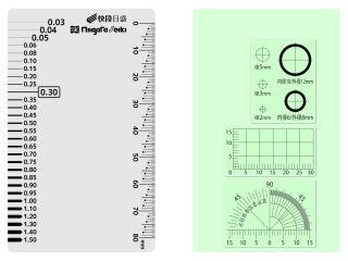 1枚で幅・長さが測れます、透明で測りやすく、やわらかくて扱いやすいポリエステル製、名刺サイズなので携帯に便利