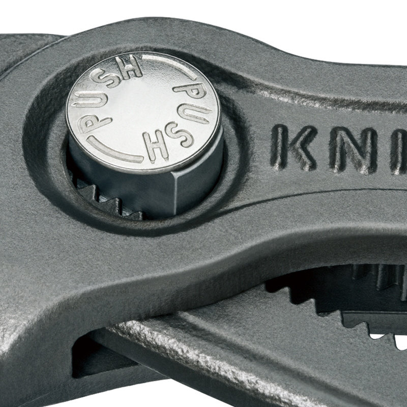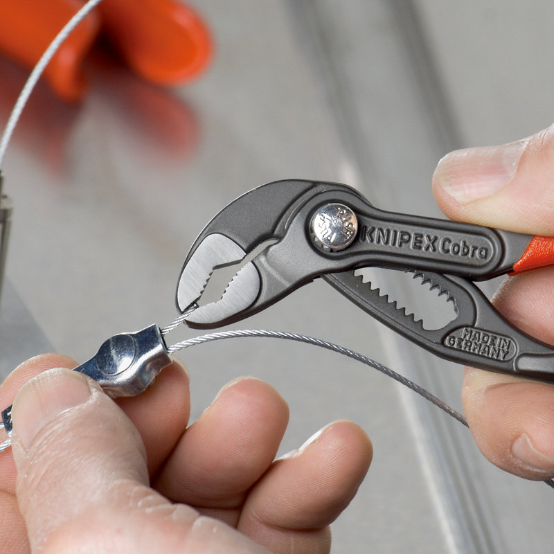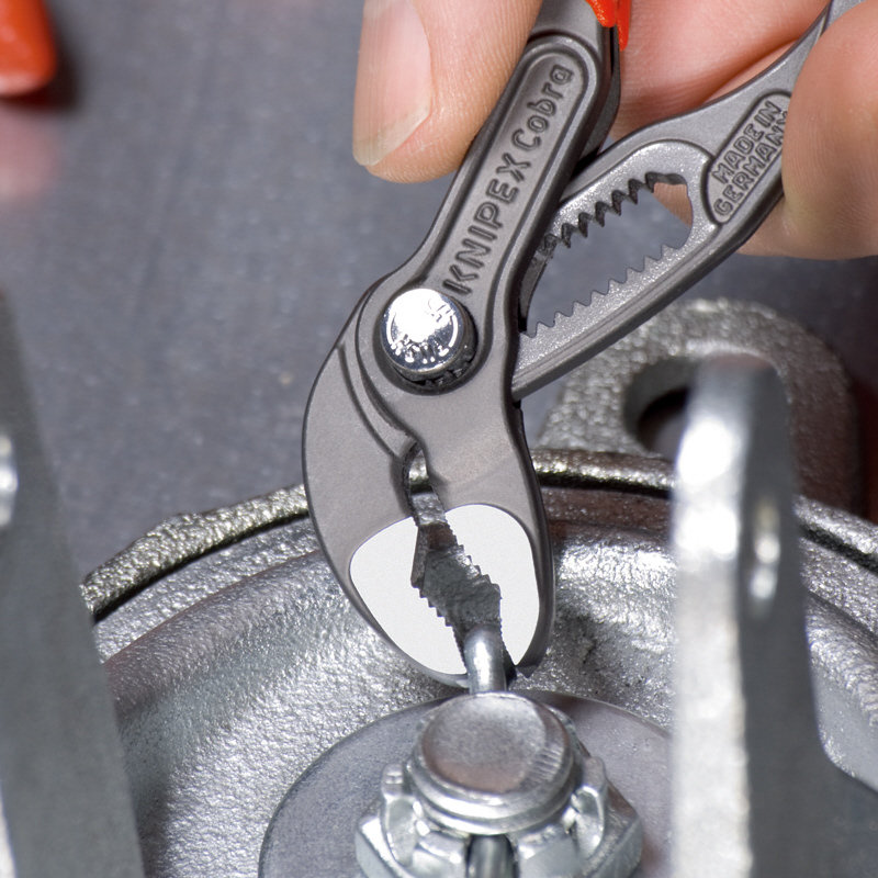 ●ヘッド仕上げ:グレー防錆コート、磨き●ハンドル仕様:プラスチックコーティング(滑り防止仕上げ)●つかみ面:横すじ入り●調整段数:11●パイプつかみ能力(径mm):32●ナットつかみ能力(mm):30●全長(mm):150●質量(g):145●KNIPEXの“コブラ”は高性能なウォーターポンププライヤーです。●ジョイント部は横方向へのブレを防止する3枚合わせ(ボックスジョイント)。●プッシュボタンにより、素早く簡単にアゴの幅を細かく調整できます。●アゴの開き調整はプッシュボタンにて行うため、作業中は不意に口幅が変わらないので早く快適に作業ができます。●アゴの開きは片手で調節が可能です。●上のアゴを対象物にあて、プッシュボタンを押しながら、下アゴを上にスライドさせるだけで簡単に調整することができます。●口幅を最大に調節して握っても、ハンドルの間にクリアランスを確保する指詰めストッパー付き。●少ない力でパイプやナットを確実につかむ平行四辺形のアゴ形状。●てこの原理を最大限発揮するデザインで高いグリップ力を発揮します。●入念な焼入れ処理が施されたつかみ面の硬度は約HRC61で、耐磨耗性が高く、確実なグリップを発揮します。●材質はオイル焼き入れ焼き戻し処理済みのクロームバナジウム電気鋼。