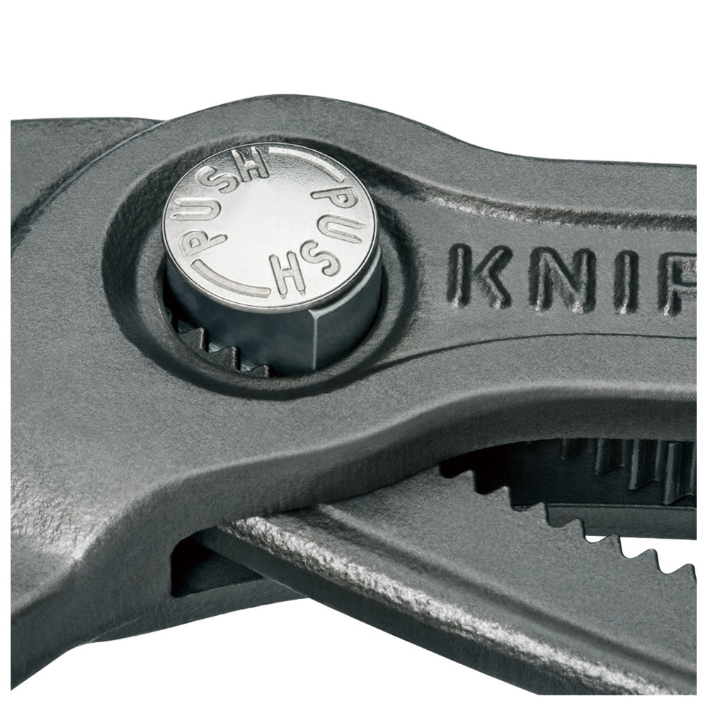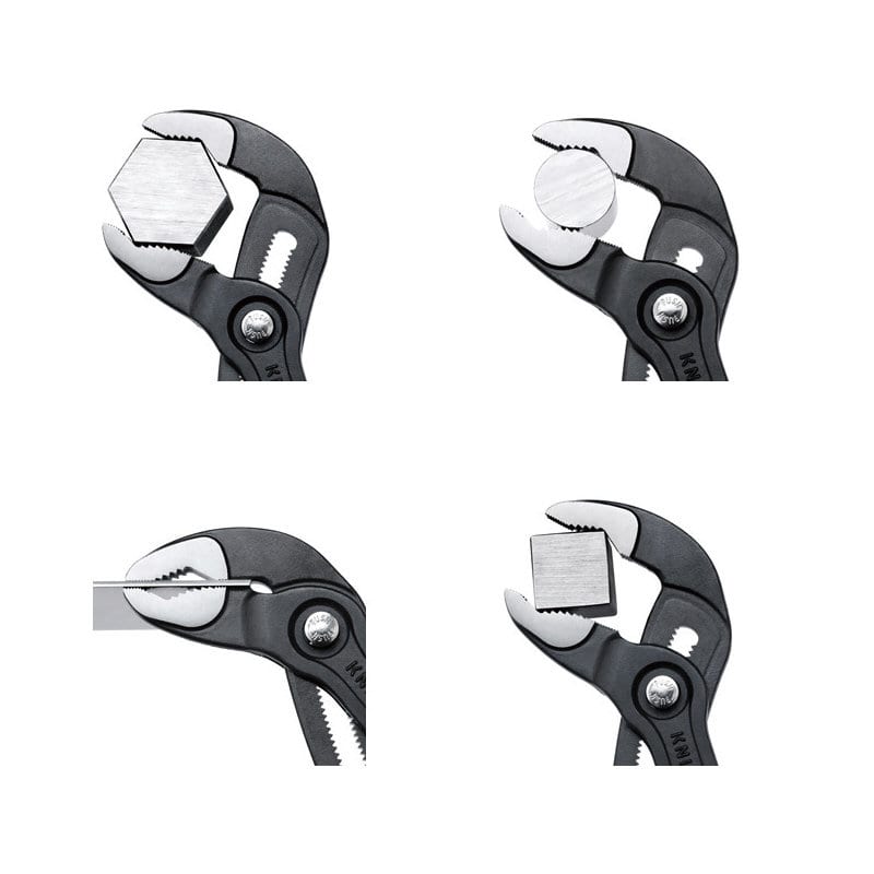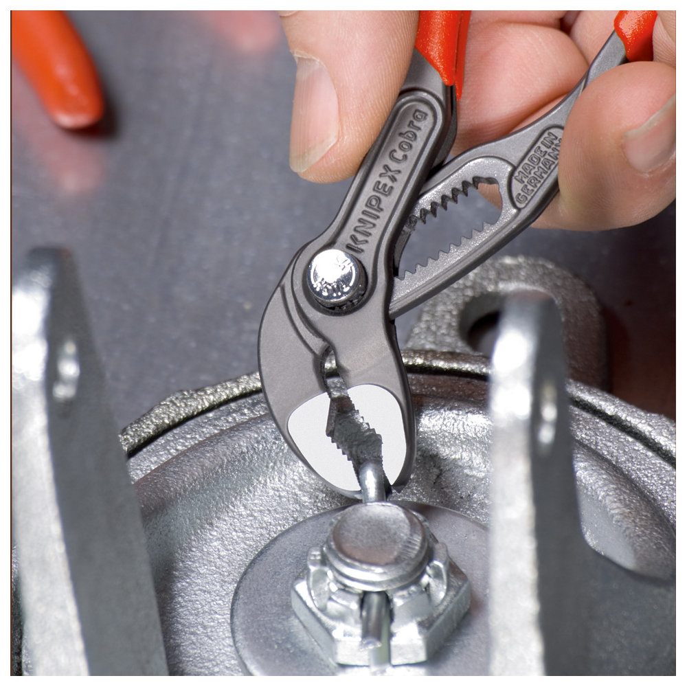 ●ヘッド仕上げ:グレー防錆コート、磨き●ハンドル仕様:プラスチックコーティング(滑り防止仕上げ)●つかみ面:横すじ入り●調整段数:18●パイプつかみ能力(径mm):42●ナットつかみ能力(mm):36●全長(mm):180●質量(g):170●KNIPEXの“コブラ”は高性能なウォーターポンププライヤーです。●ジョイント部は横方向へのブレを防止する3枚合わせ(ボックスジョイント)。●プッシュボタンにより、素早く簡単にアゴの幅を細かく調整できます。●アゴの開き調整はプッシュボタンにて行うため、作業中は不意に口幅が変わらないので早く快適に作業ができます。●アゴの開きは片手で調節が可能です。●上のアゴを対象物にあて、プッシュボタンを押しながら、下アゴを上にスライドさせるだけで簡単に調整することができます。●口幅を最大に調節して握っても、ハンドルの間にクリアランスを確保する指詰めストッパー付き。●少ない力でパイプやナットを確実につかむ平行四辺形のアゴ形状。●てこの原理を最大限発揮するデザインで高いグリップ力を発揮します。●入念な焼入れ処理が施されたつかみ面の硬度は約HRC61で、耐磨耗性が高く、確実なグリップを発揮します。●材質はオイル焼き入れ焼き戻し処理済みのクロームバナジウム電気鋼。