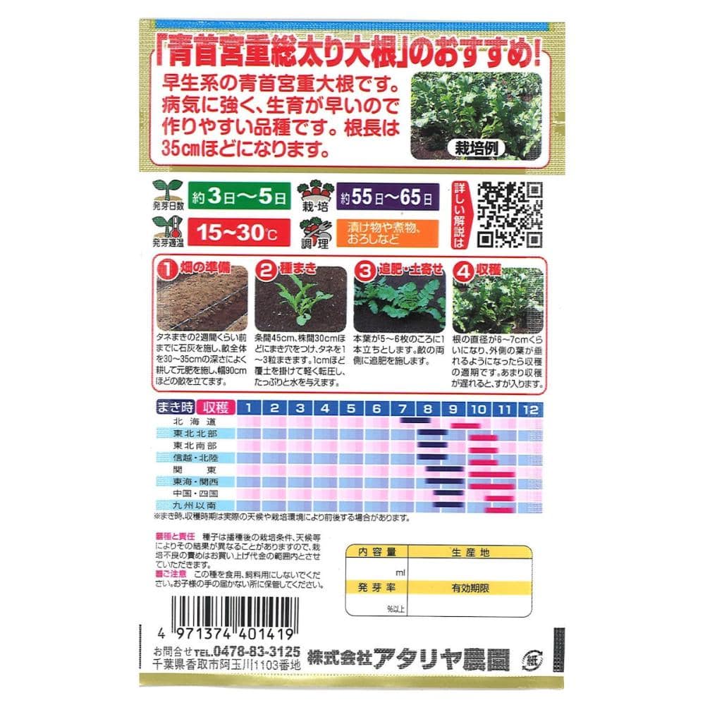 早生系の青首宮重大根です。病気に強く、生育が早いので作りやすい品種です。根長は35cmほどになります。