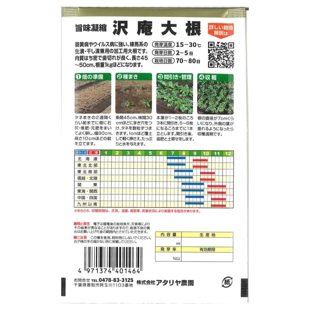 萎黄病やウイルス病に強い、練馬系の生漬・干し漬兼用の加工用大根です。肉質は緻密で歯切れの良く、長さ45~50cm、根重1kg程になります。