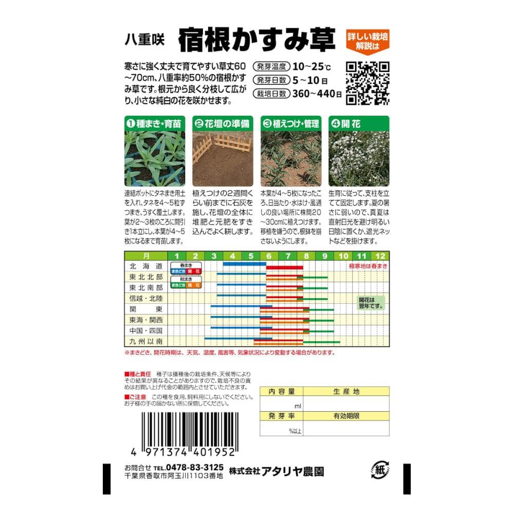 寒さに強く丈夫で育てやすい草丈60~70cm、八重率約50%の宿根かすみ草です。よく株元から分枝して広がり、小さな純白の花を咲かせます。
