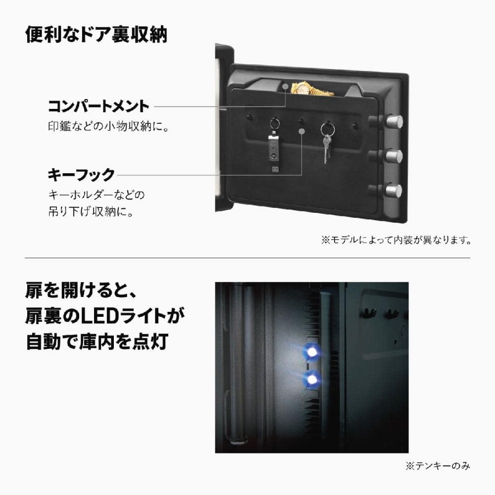 セントリー独自の耐火材「ピロノックス」により、金庫の厚い壁面をスリムにすることに成功。高い耐火性能を備えながらも、A4ファイル収納可能な広々とした庫内を実現しました。 整理整頓に便利な鍵付ドロワー(鍵付引き出し)、トレイ、棚板は入れる位置を自由に調整できます。(ご購入時に装備されるものはモデル・サイズにより異なります。)