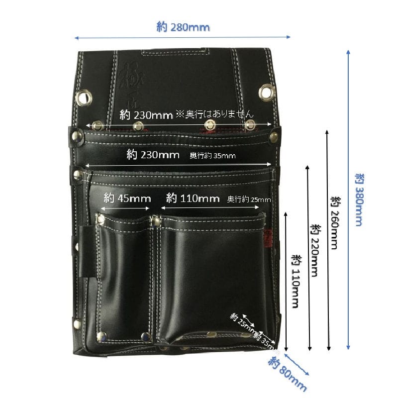 1)前面は黒染めの牛黒革と合皮を使用し、背面は型崩れしにくい三層のPE材を使用。摩擦に強く軽量なため、丈夫かつ機能的な釘袋となっております。