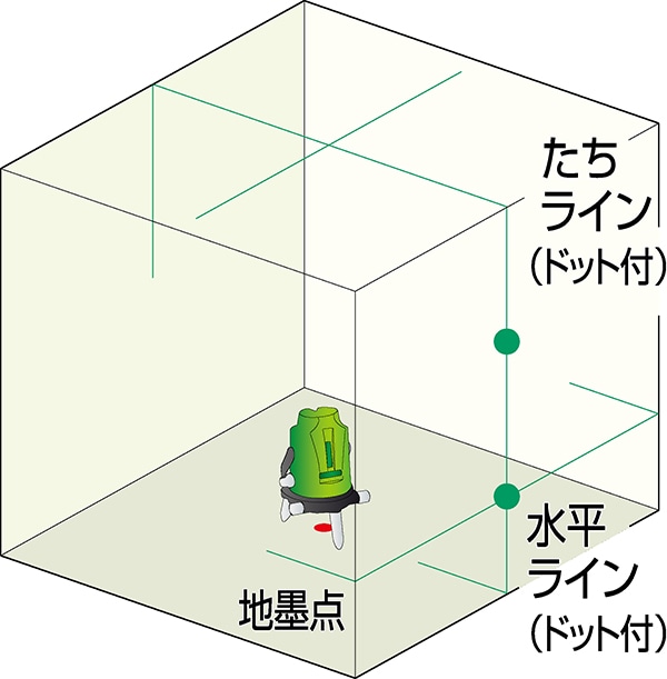 鉛直方向ラインは専用光源なので明るさ抜群!高精度:±1mm/10m(到達距離)