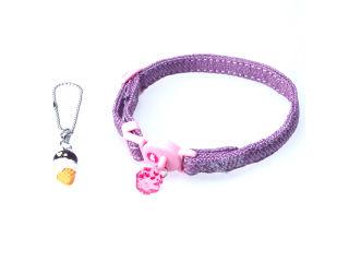 浅い藤紫の落ち着いたコケティッシュなデザイン首輪。バックルは安全設計で一定の力で外れます。鈴がなく、静かな設計。かわいいスィーツのおまけは首輪のアクセントの付け替えや、オーナーさんのチャームとして使用できます。