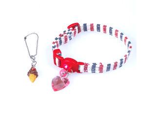 オールドデニムのようなストライプ首輪。バックルは安全設計で一定の力で外れます。かわいいスィーツのおまけは首輪のアクセントの付け替えや、オーナーさんのチャームとして使用できます。