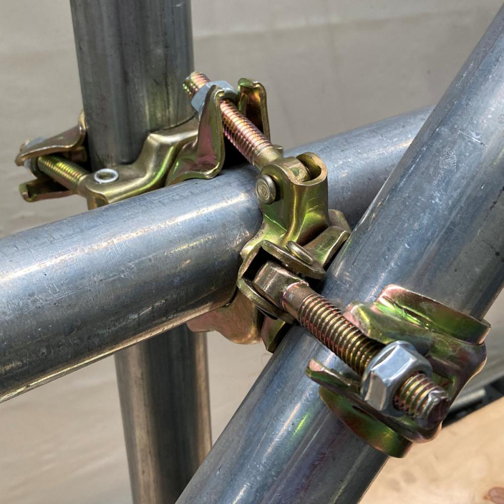 信和クランプ4大特長:1(社)仮設工業会認定品ですので安心してお使いいただけます。2強度の高い特殊鋼を使用しているため耐久性抜群。3使い易い設計のため作業効率が向上します。4徹底した品質管理のもとで生産されているので高品質です。●三連クランプの規格は48.6φ×48.6φ×48.6φです。単管パイプ3本を繋ぐことができます。●自在タイプです。