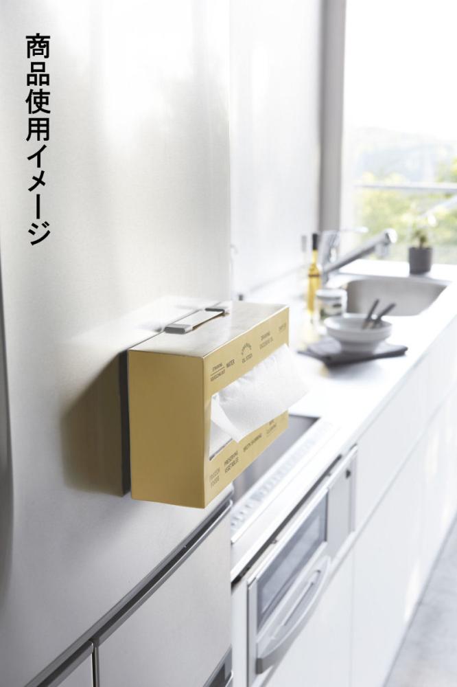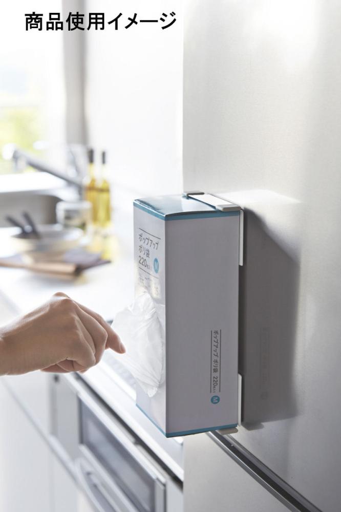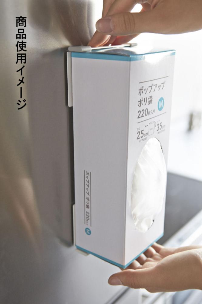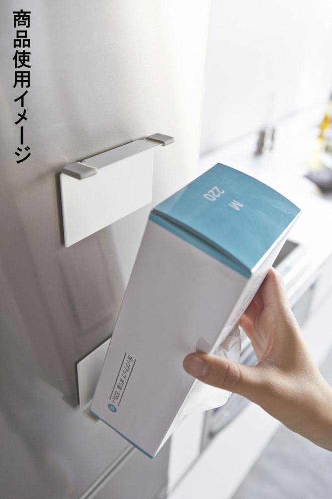 冷蔵庫の扉や側面に磁石で簡単取り付けのボックスホルダー。磁石のくっつく平らな面ならどこでも設置可能。ボックスを挟み込むだけで簡単設置。横向きでも固定可能。ポリ袋・ペーパータオル・ティッシュ箱をはさんで磁石で冷蔵庫側面などに簡単取り付け!